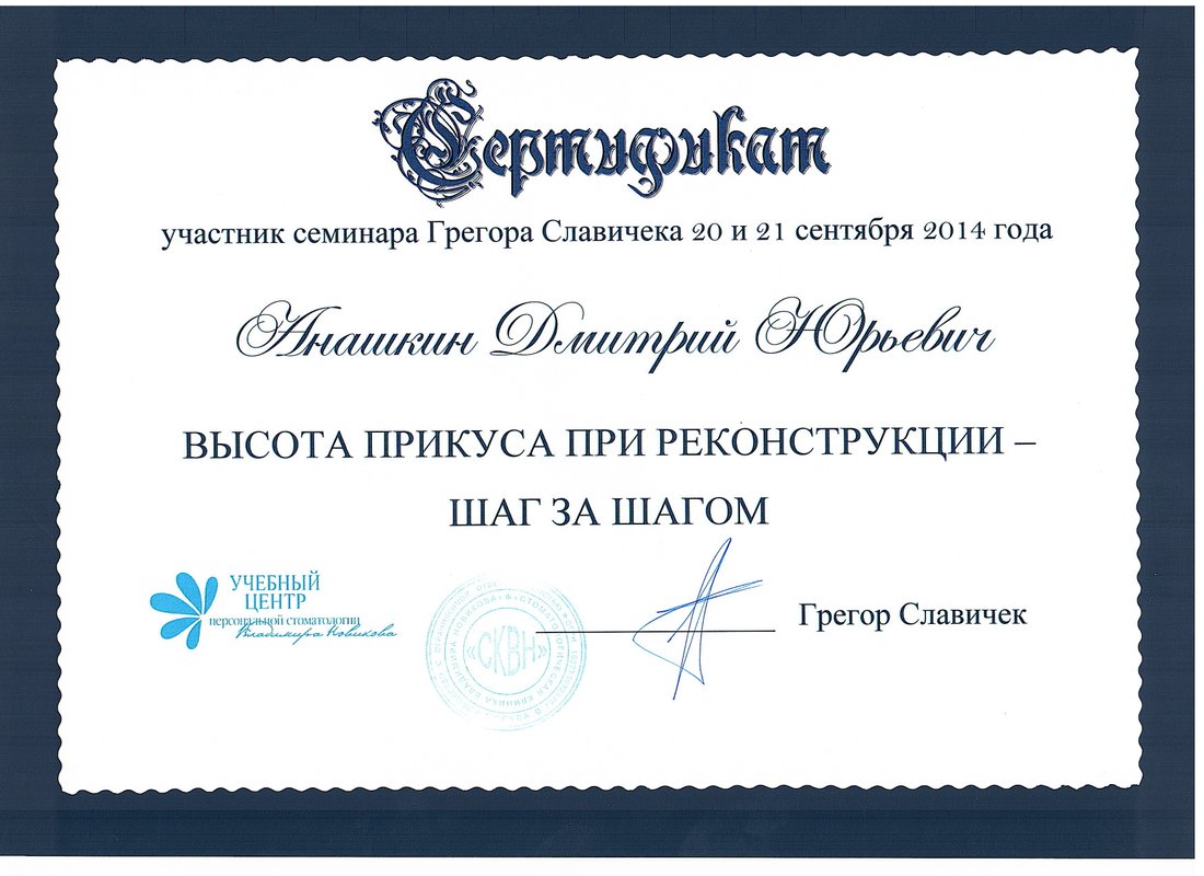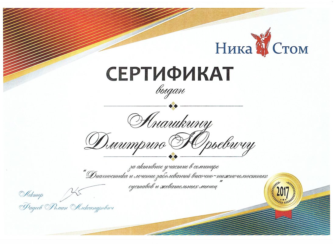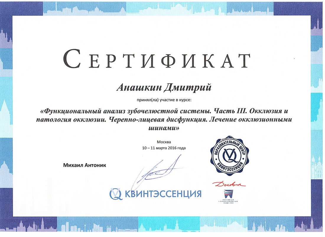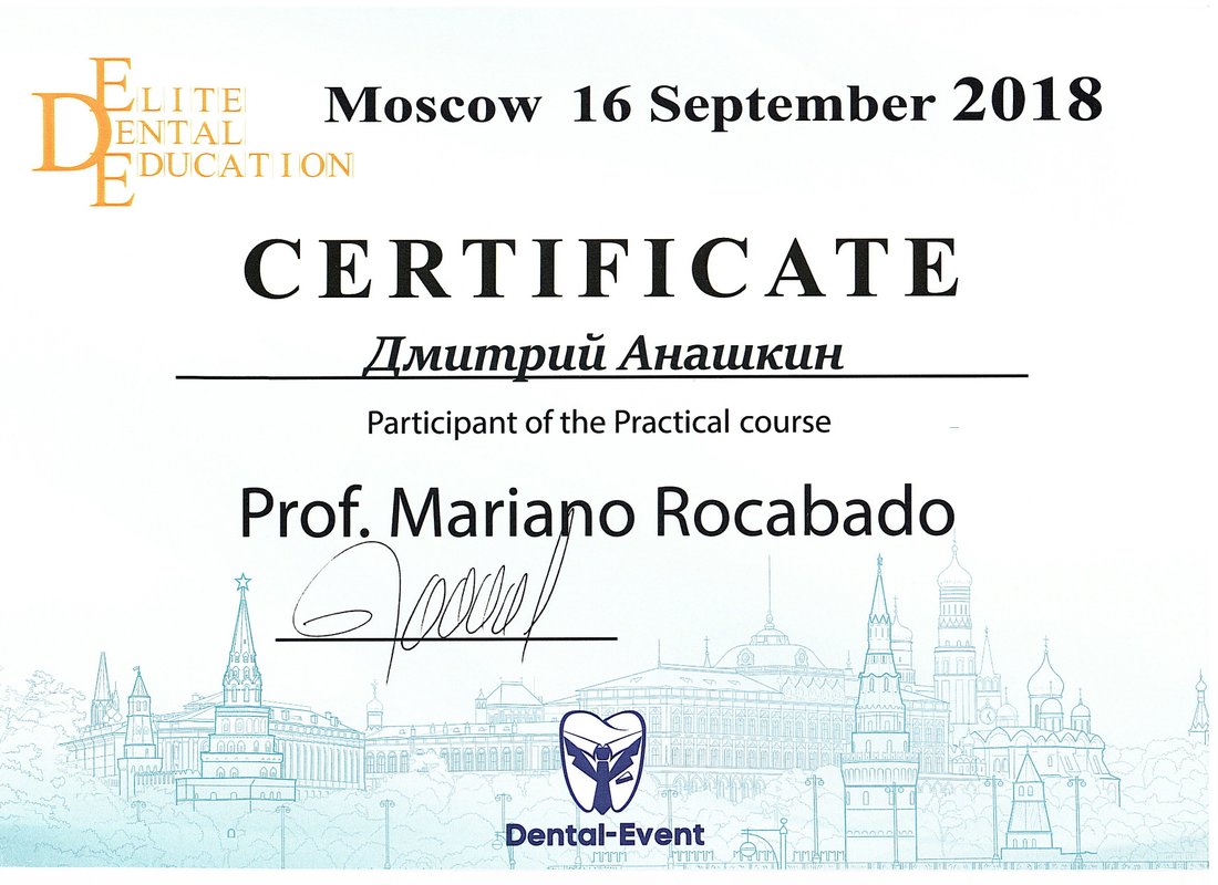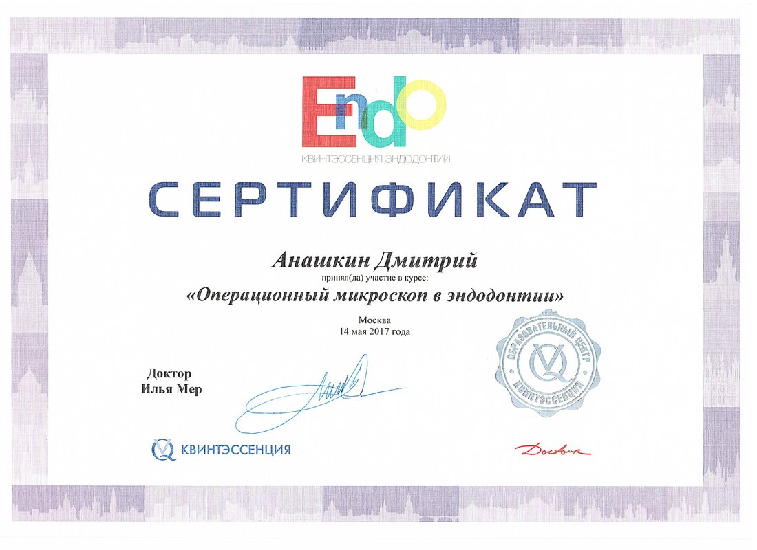 Анашкин Дмитрий Юрьевич является стоматологом-ортопедом, а также работает в сфере имплантологии и стоматологической хирургии. Дмитрий Анашкин в том числе устанавливает безметалловые протезы, выполняет несъемное протезирование зубов, а также делает пластику тканей полости рта. Вы можете обратиться к Дмитрию Анашкину, если вам необходимо восстановить утраченный зуб или если один из зубов находится в таком состоянии, что с помощью простой пломбы его не спасти. Протезирование предполагает профессиональную санацию зубов, поэтому перед визитом к ортопеду рекомендуется посетить стоматолога-терапевта.